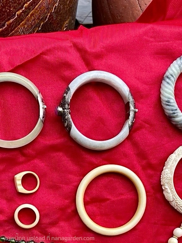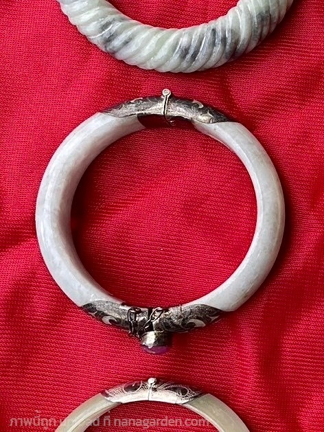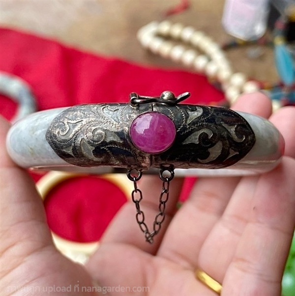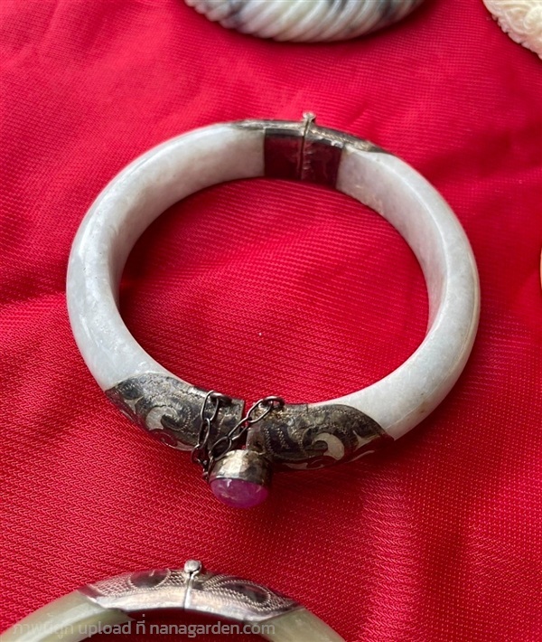 เปิดสะสม กำไลหยก กำไลหยกโบราณ ข้อต่อเนื้อเงินลายฉลุ ฝังพลอย (ทับทิม) งานเก่าสะสม อายุหลายปี สภาพสวยสมบูรณ์ ไม่ผ่านการใช้งาน