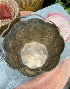 ถังเงินใส่กาน้ำชาโบราณ ทรง8เหลี่ยม ขอบโค้ง เป็นถังใช้ในการเก็บความร้อนของกาน้ำชา แบบพกพา มีหูหิ้ว แกะสลักทั้งชิ้น ลวดลายวิจิตร อลังการ พบเจอน้อย
