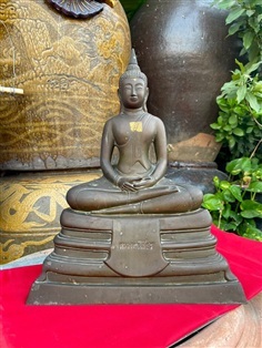 พระพุทธรูปบูชา สมเด็จพระพุทธโคดมวัดไผ่โรงวัว จ.สุพรรณบุรี ปีพ.ศ. 2505 เนื้อทองเหลืองโลหะผสม หน้าตัก9นิ้ว ฐานกว้าง12x16นิ้ว