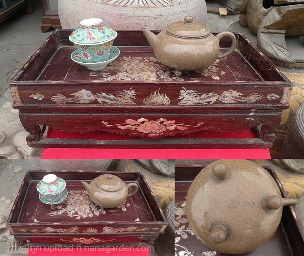 ฐานไม้ (กี๋) สำหรับวางกาน้ำชา ศิลปะจีนโบราณ ประดับมุก งานจิตกรรมของช่างฝีมือยุคเก่า มีลวยลายและเอกลักษณ์ไม่เหมือนใคร