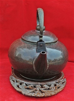 กาน้ำชาดินเผา (ปั้นชา/ป้านชา) ต้นดำเนิดจากเมืองอี๋ซิง Yixing มณฑลเจียงซู ประเทศจีน กาน้ำชาเก่าสะสม สีดินดำ ทรงสุ่ยผิง (ทรงลูกแก้ว) ผิวขัดเงา ขนาดใหญ่ หูจับทองเหลือง เป็นงานละเอียด ปราณีต ซึ่งต้องใช้ระยะเวลาและฝีมือ ใต้ฐานตีปั๊มตราจีน บ่งบอกถึงผู้จัดสร้าง