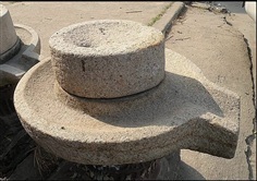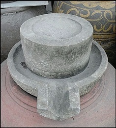 เครื่องบดแป้งเนื้อหินแกะ ลักษณะเป็นครกทรงกลม มีฝาบนกับฐานล่าง ซึ่งมีรู มีร่องฟัน และแอ่งสำหรับเป็นทางไหล เพื่อบดข้าวเป็นแป้ง ซึ่งให้สัมผัสที่หอมเป็นเอกลักษณ์ เป็นครกบดที่แกะสลักจากหินแกรนิตแบบโบราณจะหายากกว่า ซึ่งจะมีความทนทาน อายุใช้งานยาวนานกว่าครกบดสมัยใหม่ที่หล่อด้วยปูนซีเมนต์