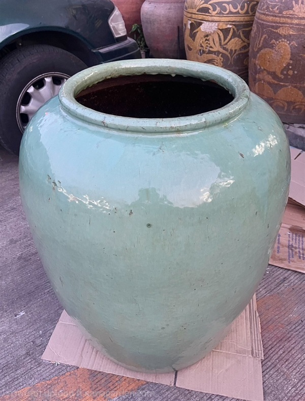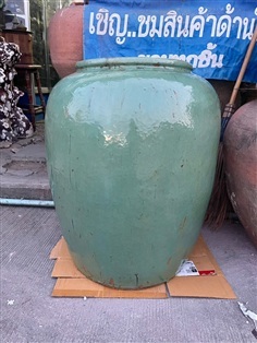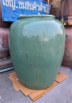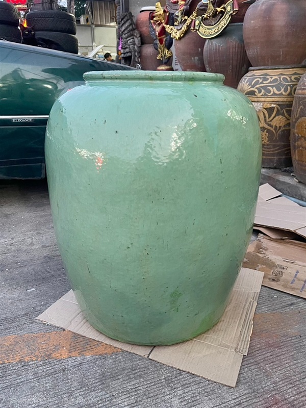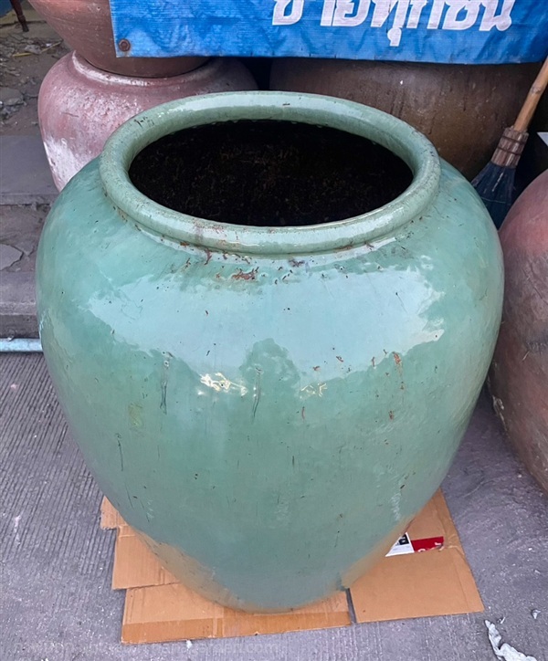 โอ่งปั้นดินเผาจีน น้ำเคลือบสีเขียวไข่กา เก่าแท้โบราณ ไม่แตกไม่ร้าว ไซต์ใหญ่ นำเข้าจากจีนโดยเรือสำเภา ช่วงสมัย ร.4 ร.5 เป็นภาชนะบรรจุสิ่งของลงเรือมาขาย แล้วไม่ได้นำกลับด้วย โอ่งเปล่าทิ้งไว้จึงกลายเป็นของล้ำค่าน่าสะสม
