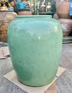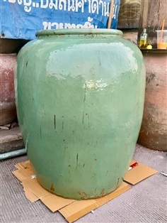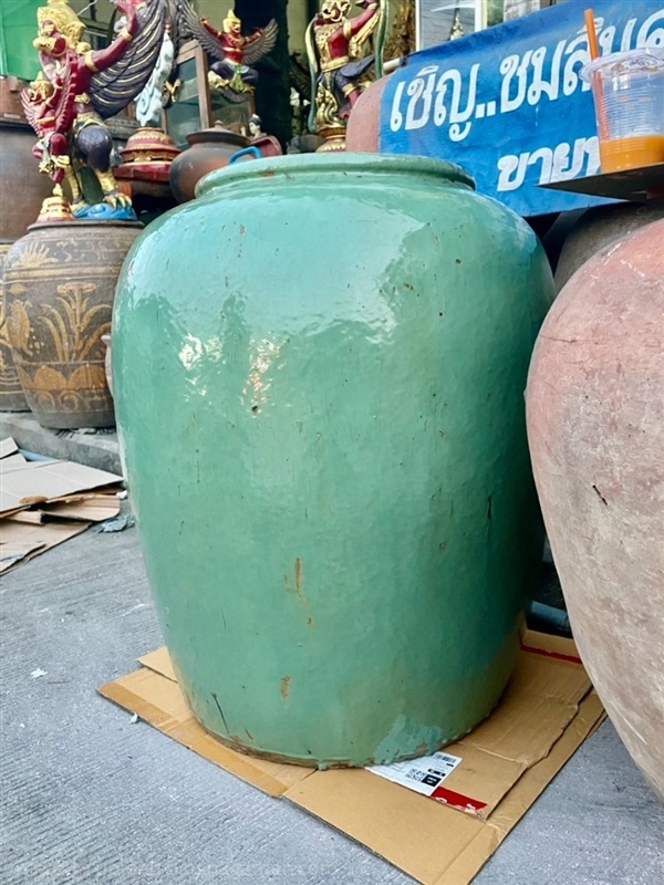 โอ่งปั้นดินเผาจีน น้ำเคลือบสีเขียวไข่กา เก่าแท้โบราณ ไม่แตกไม่ร้าว ไซต์ใหญ่ นำเข้าจากจีนโดยเรือสำเภา ช่วงสมัย ร.4 ร.5 เป็นภาชนะบรรจุสิ่งของลงเรือมาขาย แล้วไม่ได้นำกลับด้วย โอ่งเปล่าทิ้งไว้จึงกลายเป็นของล้ำค่าน่าสะสม