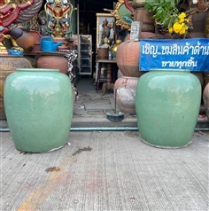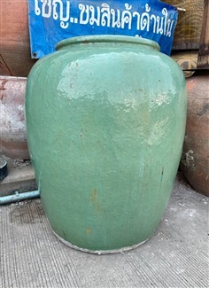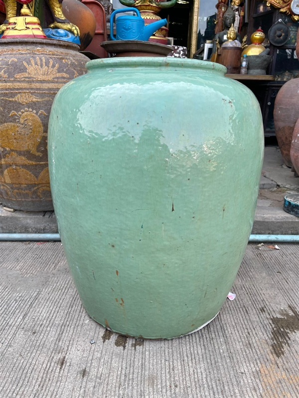 โอ่งปั้นดินเผาจีน น้ำเคลือบสีเขียวไข่กา เก่าแท้โบราณ ไม่แตกไม่ร้าว ไซต์ใหญ่ นำเข้าจากจีนโดยเรือสำเภา ช่วงสมัย ร.4 ร.5 เป็นภาชนะบรรจุสิ่งของลงเรือมาขาย แล้วไม่ได้นำกลับด้วย โอ่งเปล่าทิ้งไว้จึงกลายเป็นของล้ำค่าน่าสะสม
