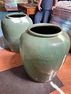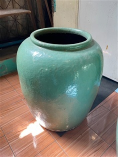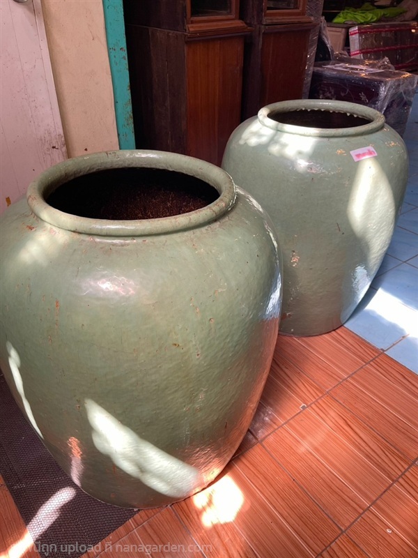 โอ่งปั้นดินเผาจีน น้ำเคลือบสีเขียวไข่กา เก่าแท้โบราณ ไม่แตกไม่ร้าว ไซต์ใหญ่ นำเข้าจากจีนโดยเรือสำเภา ช่วงสมัย ร.4 ร.5 เป็นภาชนะบรรจุสิ่งของลงเรือมาขาย แล้วไม่ได้นำกลับด้วย โอ่งเปล่าทิ้งไว้จึงกลายเป็นของล้ำค่าน่าสะสม