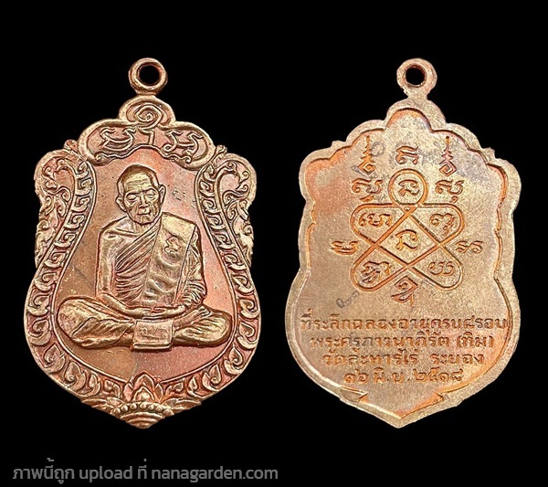 ตรงกลางเป็นรูปเหมือนหลวงปู่ทิม นั่งสมาธิเต็มองค์ รอบใบเสมาเป็นลายกนก โค้งลงมาบรรจบกันที่ลายกลีบบัว ด้านบนของเหรียญมีอักขระ 3 ตัว คือ “มะ อุ อะ” และเเกะโค้ดในพิมพ์เป็นอักษร “ท” ที่ชายผ้าสังฆาฏิของหลวงปู่ทิม ส่วนด้านหลังเหรียญ ด้านบนเป็นยันต์ห้า ยันต์ครูประจำตัวหลวงปู่ ต่อมาเป็นตัวอักษรว่า “ที่ระลึกฉลองอายุครบ 8 รอบ พระครูภาวนาภิรัต (ทิม) วัดละหารไร่ ระยอง 16 มิ.ย.2518”