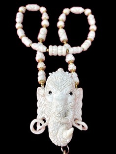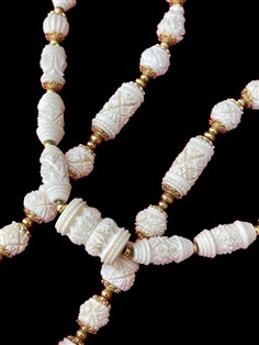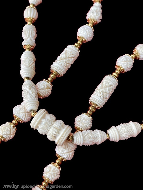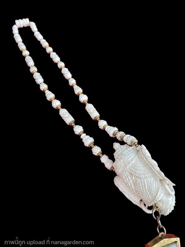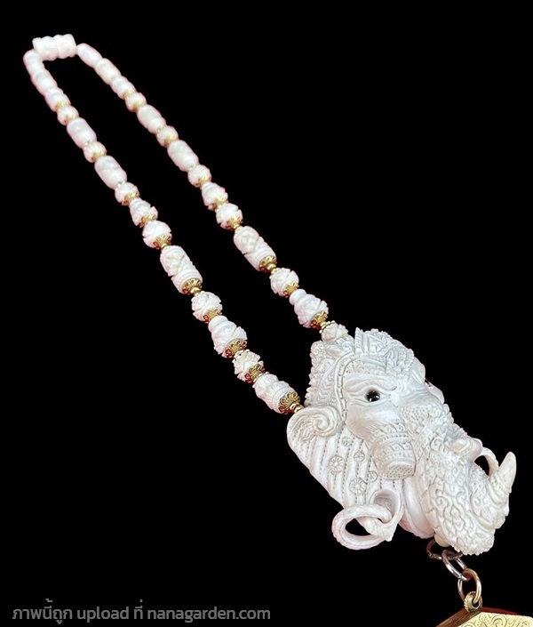 สร้อยงาช้างแกะสลัก ลายซุ้มกนกไทย งานวิจิตรศิลป์ สุดอลังการ ขนาดสวมใส่ ห้อยพระได้ งาแกะสลักทั้งเส้น ประดับคั่นด้วยลูกปัดชุปทองคำ สภาพสวยสมบูรณ์ โดยมีเม็ดปะคำงาแกะสลักหลายรูปแบบในเส้นเดียว มีทั้งทรงน้ำเต้า ทรงมะยม ทรงกรวย และทรงกระบอก โดยเฉพาะหัวสร้อยงา เป็นปลายงาตันชิ้นใหญ่ แกะสลักรูปเศียรพระพิฆเนศ (เอราวัณ) ติดพลอยสีดำ มีตุ้มหูห้อยในตัวแบบอิสระ