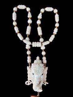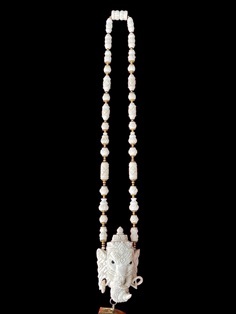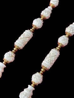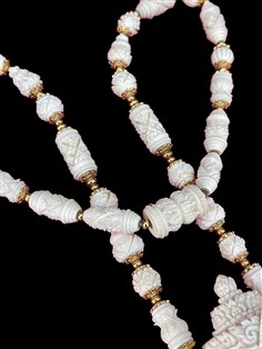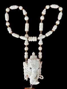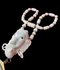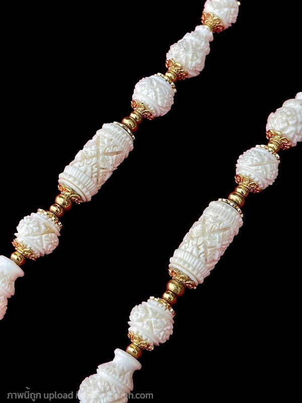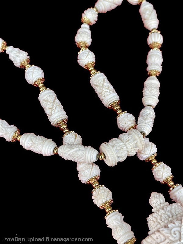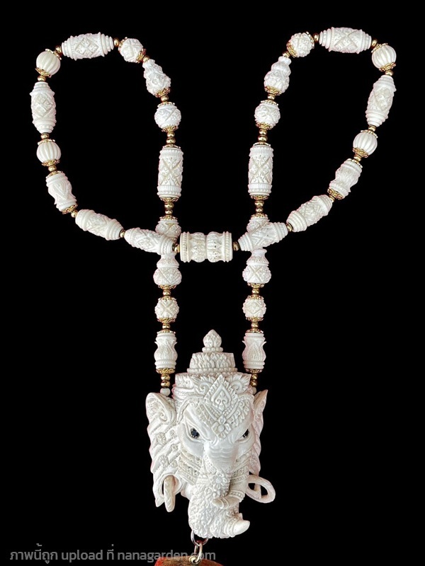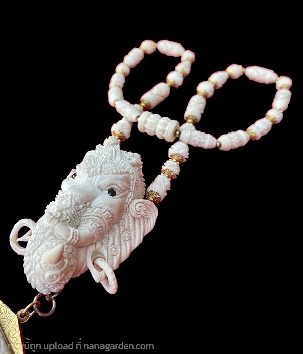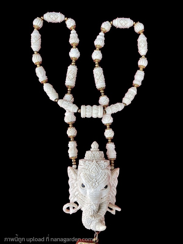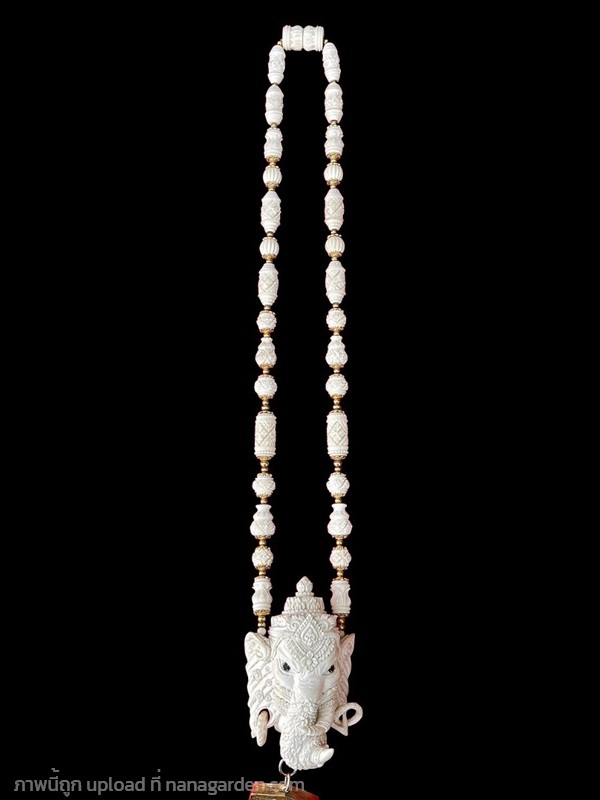 สร้อยงาช้างแกะสลัก ลายซุ้มกนกไทย งานวิจิตรศิลป์ สุดอลังการ ขนาดสวมใส่ ห้อยพระได้ งาแกะสลักทั้งเส้น ประดับคั่นด้วยลูกปัดชุปทองคำ สภาพสวยสมบูรณ์ โดยมีเม็ดปะคำงาแกะสลักหลายรูปแบบในเส้นเดียว มีทั้งทรงน้ำเต้า ทรงมะยม ทรงกรวย และทรงกระบอก โดยเฉพาะหัวสร้อยงา เป็นปลายงาตันชิ้นใหญ่ แกะสลักรูปเศียรพระพิฆเนศ (เอราวัณ) ติดพลอยสีดำ มีตุ้มหูห้อยในตัวแบบอิสระ