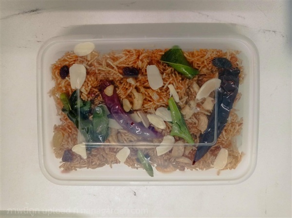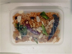 เส้นหมี่ทอดกรอบคลุกกับน้ำซอสข้นเหนียวปรุงรสเปรี้ยว เค็ม หวาน โรยหน้าลูกเกด เม็ดมะม่วงหิมพานต์ สามารถเก็บได้นานในตู้เย็น หลังจากเปิดกล่องรับประทาน ไม่เสียรสชาดและความกรอบ