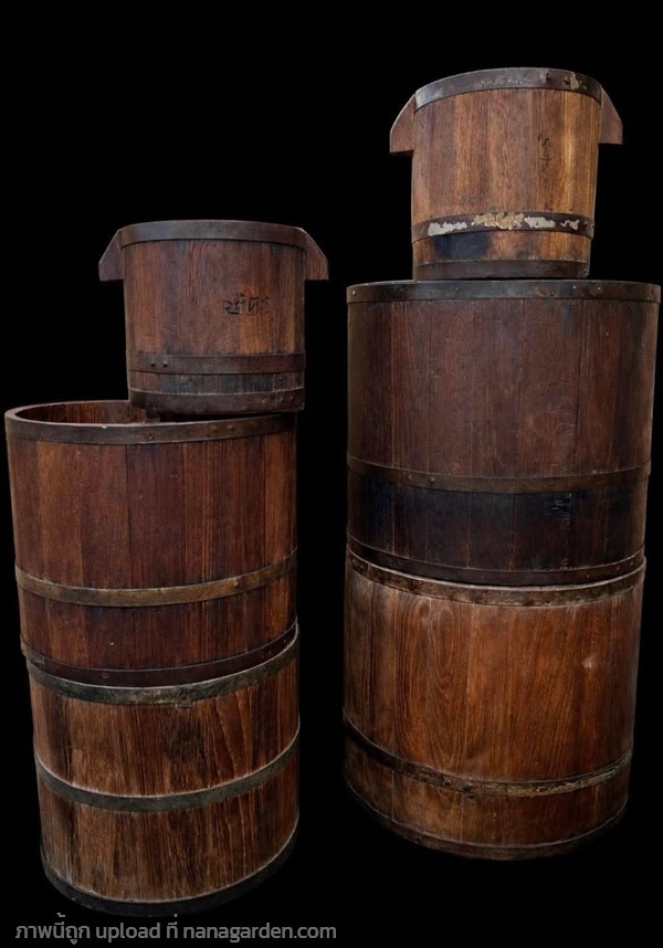 ถังไม้ตวงข้าวสารโบราณ ที่จับด้านนอก (ตัวเมีย) และที่จับด้านใน (ตัวผู้)โดยจะเป็นงานไม้สัก สภาพแข็งแรง