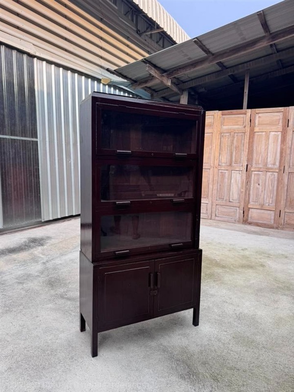 ตู้ใส่หนังสือบานเปิดขึ้นขาหมูสองชั้นเทินหัวบัวคว่ำงานเก่าไม้สักทั้งตัว ด้านบนเป็นชั้นโชว์สามชั้นบานกระจกเปิดขึ้น ด้านล่างเป็นบานเปิดทึบภายในมีชั้นวางสองชั้น เหมาะสำหรับเก็บหนังสือหรือของสะสม ตัวขวาสุดมีไม้ล็อกสำหรับล็อกบานเปิดทั้งสามบาน โครงสร้างแข็งแรง สีเข้มคลาสสิกสวยเรียบ