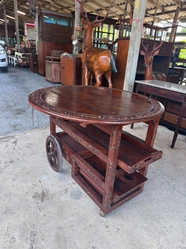 รถเข็นเสิร์ฟไม้สักแกะลายโบราณงานเก่าอายุราว 30-40