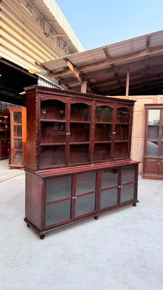 ตู้เทินหัวบัวข้างปล้องอ้อยจิกลายทั้งใบ อายุเกิน 70 ปีงานไม้สักเก่าฝีมือช่างละเอียด ตัวตู้และขอบบานจิกลายทั้งใบ ลายคมชัดสวยงาม หัวบัวรับกับเสาปล้องอ้อยอย่างลงตัว สามารถแยกได้เป็นสองท่อนบนล่าง สะดวกต่อการขนย้าย สีเดิมทั้งใบ ไม้ด้านข้างของทั้งชั้นบนและชั้นล่างเป็นไม้แผ่นเดียว แสดงถึงงานเก่าคุณภาพดี เหมาะสำหรับจัดวางของสะสม เครื่องแก้ว หรือใช้เป็นตู้โชว์ในบ้านและร้านสไตล์คลาสสิก
