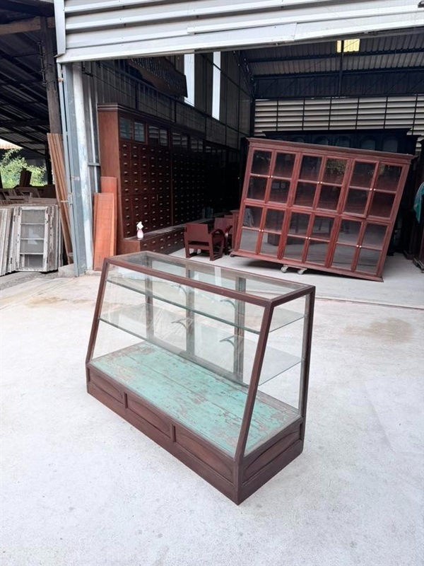 ตู้ร้านขายขนม ลูกฟักไข่หกลูก อายุเกิน 60 ปีตู้ทรงคางหมูงานเก่า โครงสร้างแข็งแรง ลูกฟักไข่หกช่องด้านล่างเป็นเอกลักษณ์ ฐานไม้สักสีเดิมสวยคลาสสิก ด้านบนเป็นชั้นวางสามชั้น โดยสองชั้นบนเป็นกระจกใส มองเห็นของด้านในได้ชัดเจน เหมาะสำหรับจัดวางขนม เบเกอรี่ หรือของสะสม ด้านหลังเป็นบานเลื่อน เปิดปิดสะดวกตามรูปแบบร้านค้าโบราณ งานยุคเก่านิยมใช้ในร้านขายขนมและร้านโชห่วยขนาดใหญ่ ให้บรรยากาศวินเทจแท้ ๆ เหมาะสำหรับตั้งโชว์หน้าร้าน คาเฟ่ หรือจัดมุมขายของให้ดูโดดเด่น