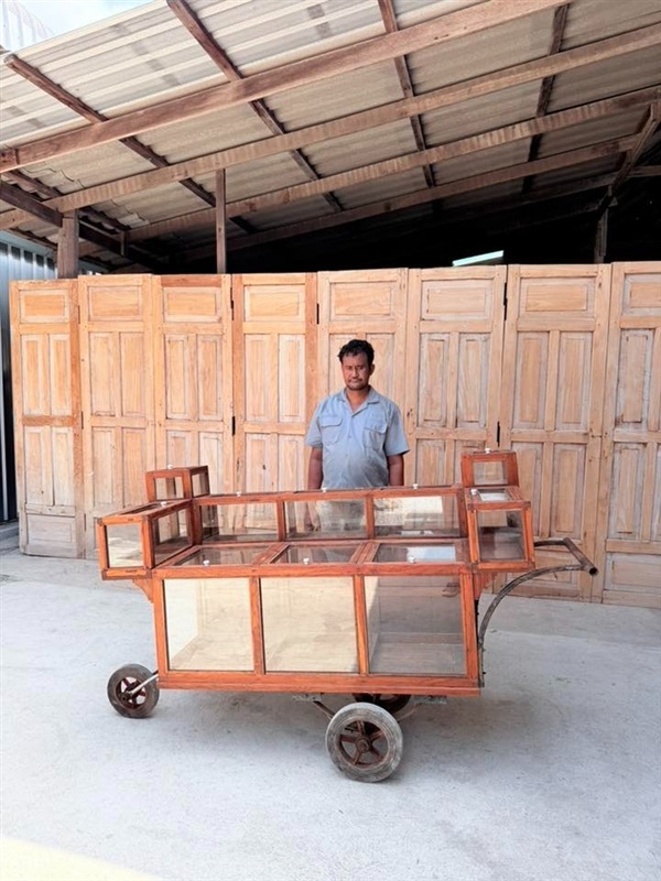 รถเข็นขายผลไม้งานเก่า อายุเกิน 60 ปี รถเข็นขายของโบราณทรงคลาสสิก ทำจากไม้สักทั้งตัว ติดกระจกใสรอบด้าน แบ่งเป็นช่องโชว์สินค้าหลายช่อง ด้านบนมีฝาเปิดสำหรับหยิบของได้สะดวก พร้อมล้อเหล็กและคันจับสำหรับเข็น ใช้งานได้ปกติ เหมาะสำหรับตั้งโชว์ ตก แต่งร้านกาแฟ ร้านอาหาร ร้านขนม หรือใช้เป็นพร็อพถ่ายภาพให้บรรยากาศย้อนยุค งานเก่าฟอร์มสวย หาชมได้ยากในสภาพสมบูรณ์แบบนี้