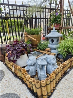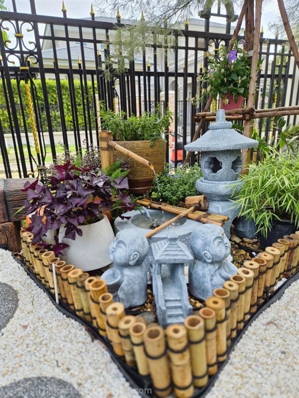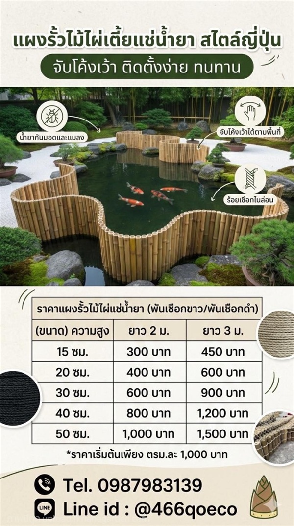 แผงรั้วเตี้ยไม้ไผ่แช่น้ำยาพันเชือกดำ สามารถนำไปวางตามพื้นที่ใช้ตกแต่งสวน ล้อมกรอบต้นไม้ บ่อปลา ราคาตารางเมตรละ 1,000 บาท(ไม่รวมติดตั้ง) สามารถทำตามขนาดและแบบที่ลูกค้าต้องการ สอบถามเพิ่มเติม Tel. 0987983139