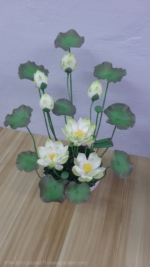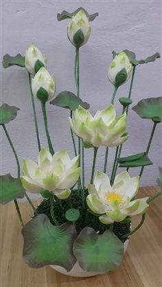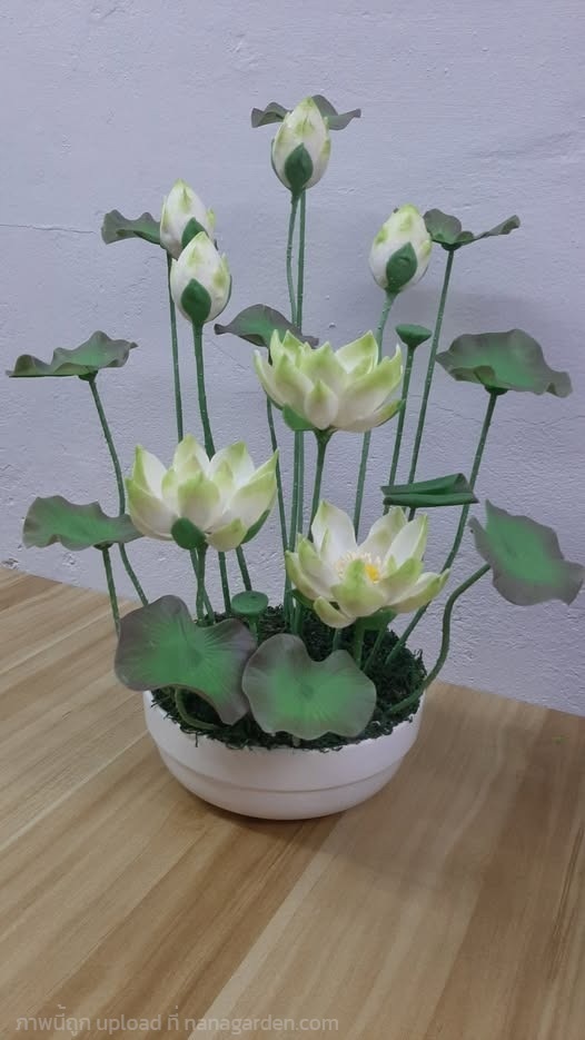 บัวหลวง ขนาดกลาง เป็นดอกไม้ประดิษฐ์จากดินไทย เป็นงานปั้น ตัวดอกสีขาว พร้อมกระถางเซรามิกสีขาว ความสูงนับจากก้นกระถางถึงปลายยอดสูงสุด 38 cm. หน้าดอกกว้าง 4 cm.