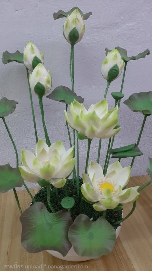 ตกแต่งด้วยหญ้ามอส ประกอบด้วย ดอกตูม ดอกบาน ฝักบัว ใบบัวแบบแบ และใบบัวแบบม้วน ปั้นแบบเหมือนจริง