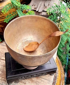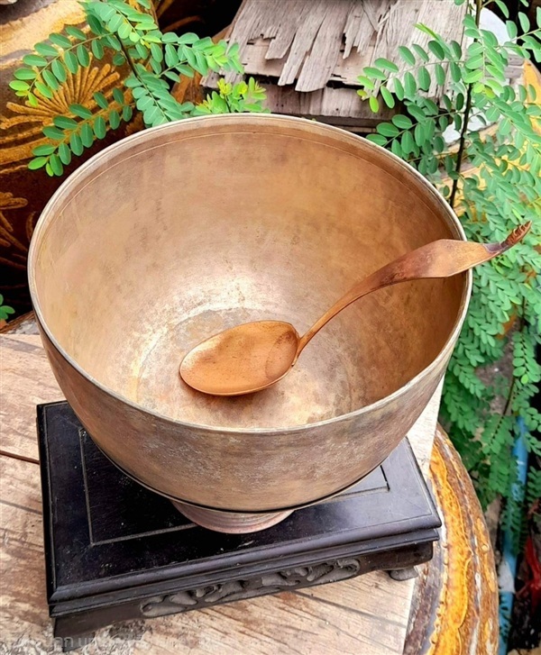 ชุดขันลงหินโบราณ เนื้อลงหิน ทรงระฆังคว่ำ (งานเคาะมือ) ขึ้นรูปแบบโบราณ สมัย ร.5 อายุกว่า100ปี เก่าแท้ ใบใหญ่ ขนาดปากกว้าง8นิ้ว มาพร้อมทัพพีและพาน เข้าชุดสวยงาม สภาพแข็งแรง เก็บไว้ใช้งานได้ยาวนาน
