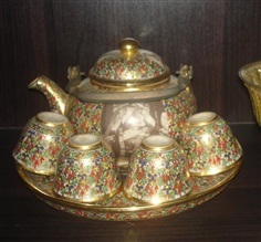 ชุดกาน้ำชาเบญจรงค์ ของไทย งานช่างฝีมือชั้นครูของไทย เป็นเครื่องปั้นดินเผาน้ำเคลือบโบราณ ศิลปะจากสมัย ร.5 (ลายน้ำทอง) หูจับทองเหลือง ลวดลายเขียนมือแบบไทย ขึ้นลายดอกเข็ม และเครือวัลย์ ลงยาครบแม่สีหลักทั้ง4สี คือสีแดง น้ำเงิน เขียว เหลือง และตัดขอบด้วยสีทอง