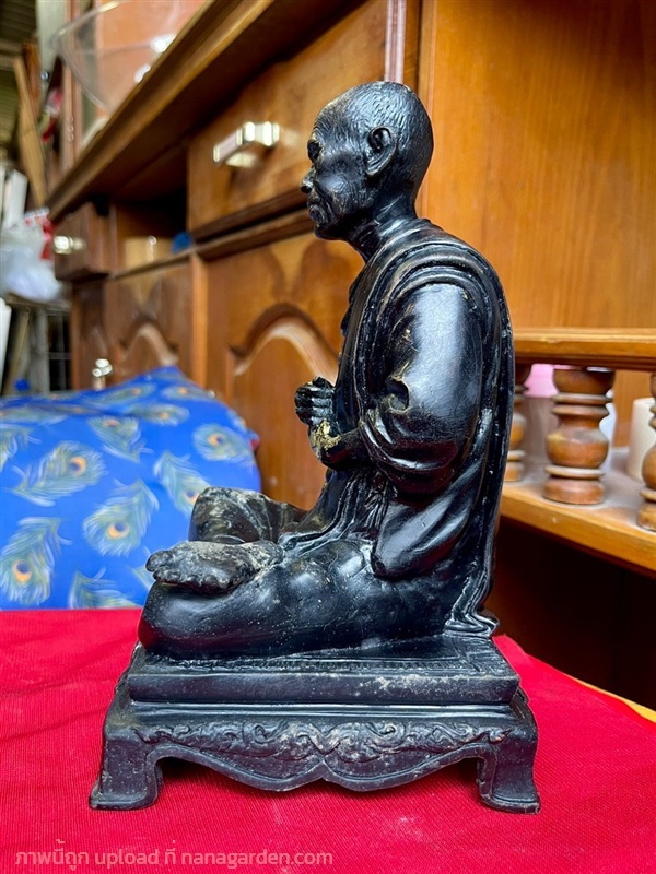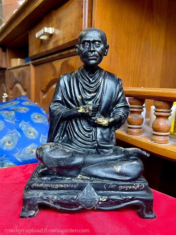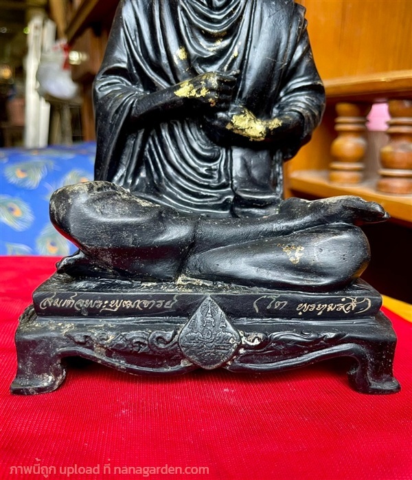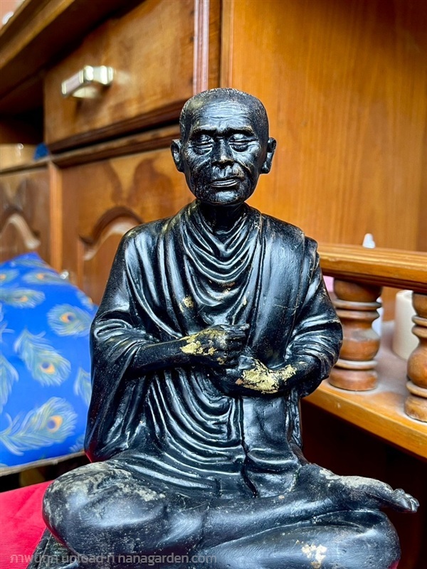 วัสดุเนื้อทองเหลืองรมดำ หล่อหนา ตกแต่งด้วยการปิดแผ่นทองเก่าบริเวณองค์พระ มีความเข้มขลังและเก่าเป็นธรรมชาติตามกาลเวลา