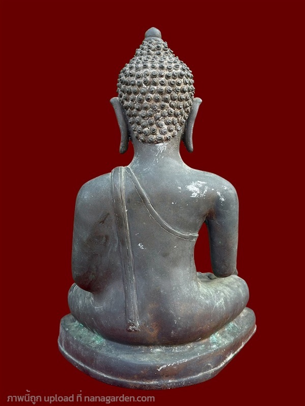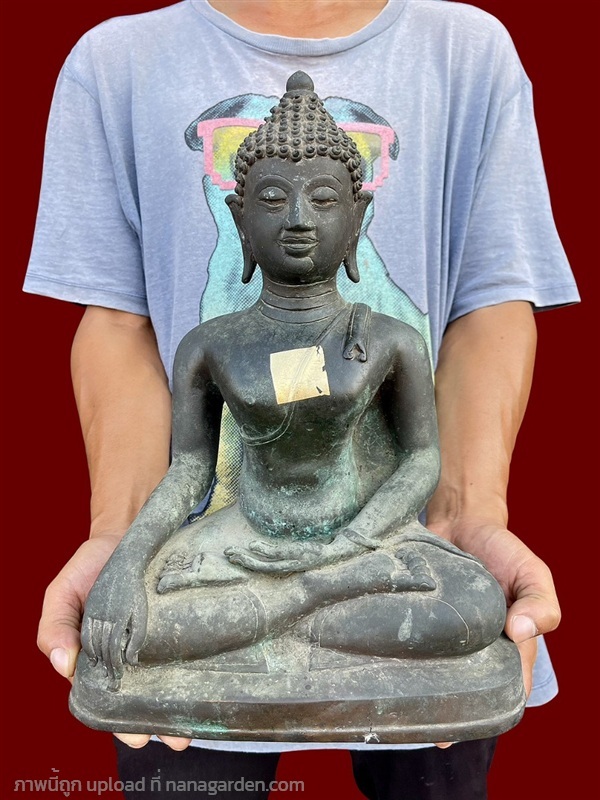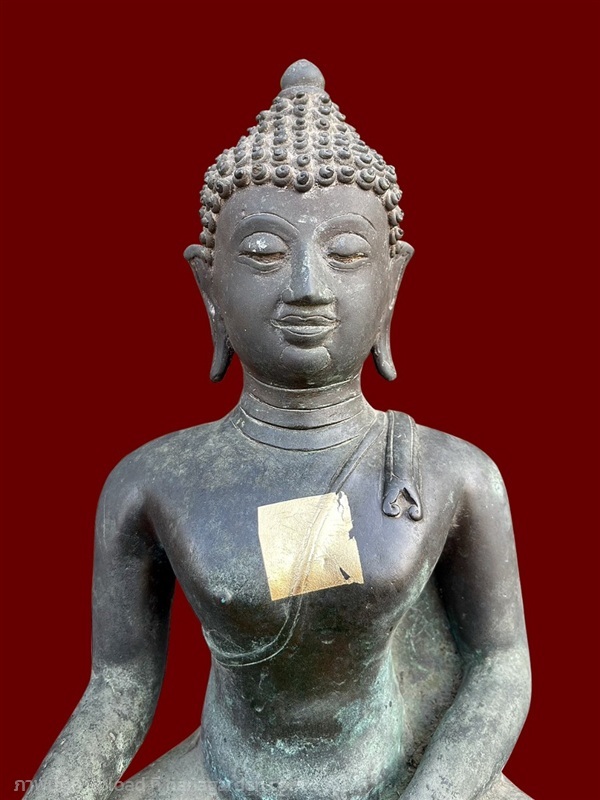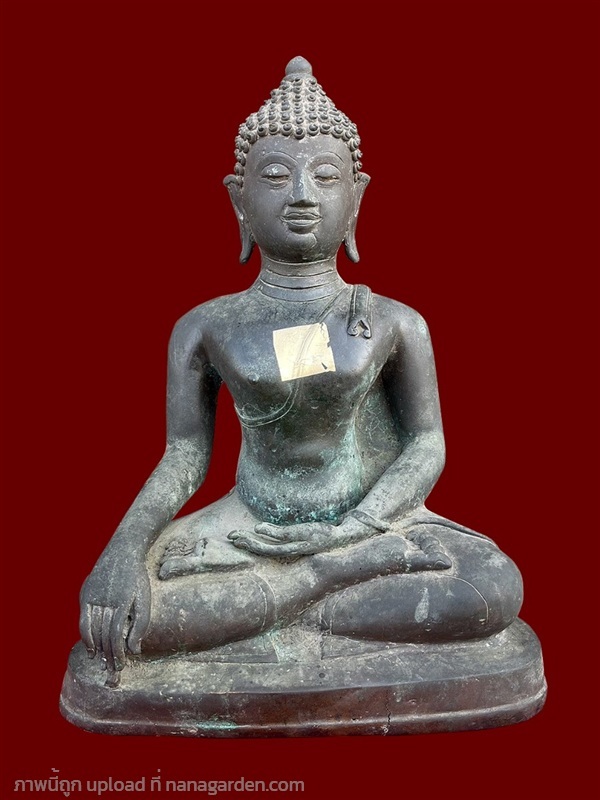 พระบูชา เนื้อโลหะสำริด พระพุทธรูปโบราณ สภาพเก่าสวย ศิลปะเชียงแสน สิงห์หนึ่ง พระเกศเป็นลักษณะบัวตูม พระศกขมวดเป็นก้นหอยชัดเจน ครองจีวรห่มเฉียง สังฆาฎิอยู่เหนือราวนมปลายเป็นแฉกคล้ายเขี้ยวตะขาบ ฐานเรียบไม่มีลาย (ตรงฐานแตกร้าวเป็นเส้นตำหนิ 1จุดด้านหน้า) ใต้ฐานดินไทย