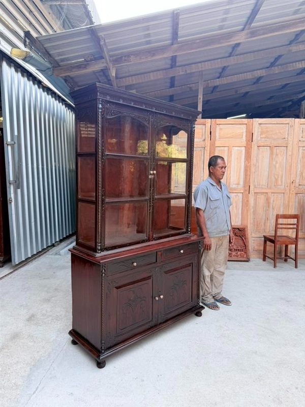 ตู้ไทยข้างเกลียวเชือก กระจกวุ้น อายุเกิน 60 ปีตู้ไทยงานเก่าฟอร์มสวย ข้างเสาเป็นลายเกลียวเชือก ด้านข้างเป็นกระจกวุ้นเดิมทั้งใบ บานหน้าเป็นกระจก ภายในมีชั้นวางสำหรับจัดโชว์ของสะสม ด้านล่างมีลิ้นชัก 2 ลิ้นชัก และบานเปิดเก็บของ ภายในมีชั้นวางอีกชั้น หน้าลิ้นชัก บานเปิด และขอบตู้จิกลายงานฝีมือเก่าทั้งหมด ตัวตู้แยกได้ 2 ท่อน บน–ล่าง เคลื่อนย้ายสะดวก ภายนอกมีเก็บสีมาเล็กน้อย งานไม้เก่าสภาพดี เหมาะสำหรับตั้งโชว์ของสะสมหรือใช้ตก แต่งบ้านและร้านแนวคลาสสิก