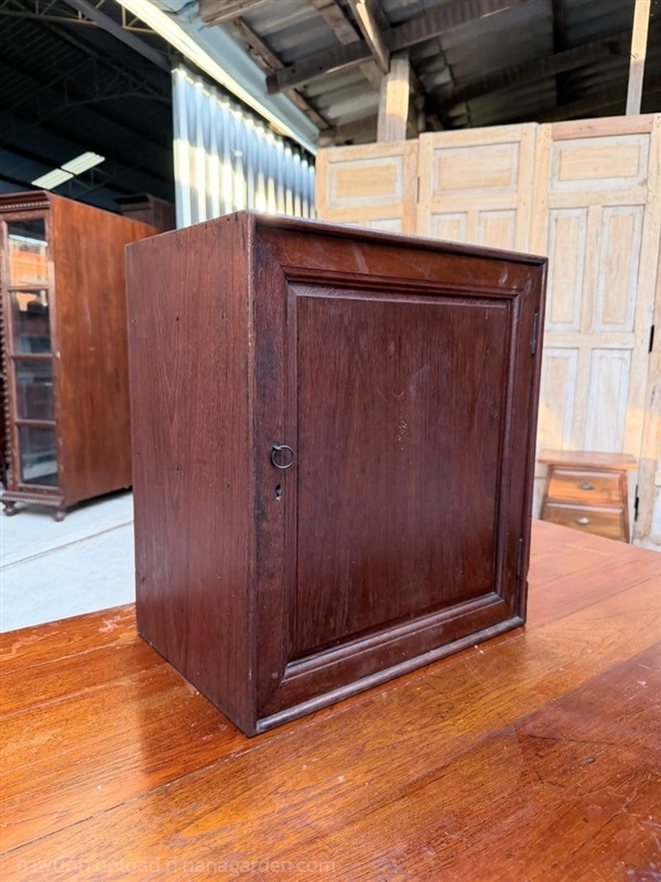 ตู้ทรงกะทัดรัด บานเปิดเดี่ยวหน้าลูกฟัก 45 องศา ภายในแบ่งเป็นชั้นวางของ 3 ชั้น ด้านล่างสุดมีลิ้นชักเล็ก 2 ลิ้นชักสำหรับเก็บของจุกจิก งานไม้สักทั้งหลัง สีเดิมเก่าให้บรรยากาศคลาสสิก เหมาะใช้เป็นตู้เก็บของ ตู้เอกสาร หรือวางตก แต่งบ้านและร้านค้า สภาพโดยรวมสวยเดิมพร้อมใช้งาน