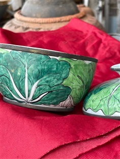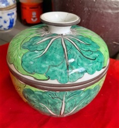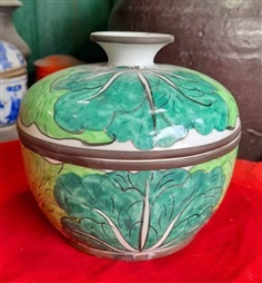 กระปุกน้ำเคลือบดินเผา พร้อมฝาปิด ลายผักกาด (แปะฉ่าย) จีนกวางตุ้ง สวยสมจริง สีเขียวอ่อนปนเขียวสด งานวิจิตรศิลป์ของเชิงช่างสมัยก่อน (ที่จับตรงฝามีเส้นร้าว1จุด ไม่มีผลกับการเก็บสะสมครับ)
