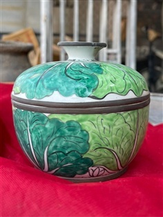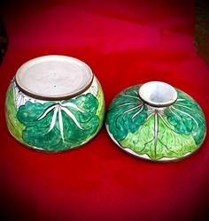 กระปุกน้ำเคลือบดินเผา พร้อมฝาปิด ลายผักกาด (แปะฉ่าย) จีนกวางตุ้ง สวยสมจริง สีเขียวอ่อนปนเขียวสด งานวิจิตรศิลป์ของเชิงช่างสมัยก่อน (ที่จับตรงฝามีเส้นร้าว1จุด ไม่มีผลกับการเก็บสะสมครับ)