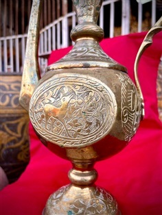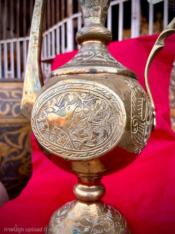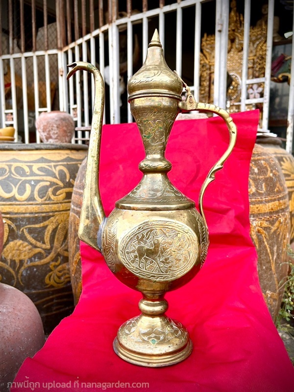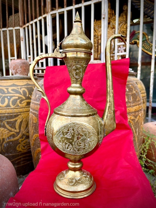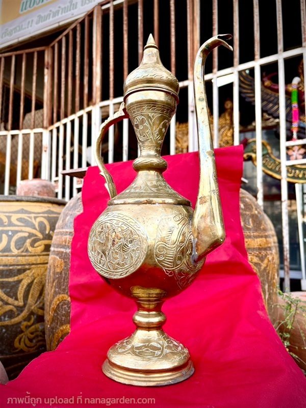 กาน้ำทองเหลืองทรงสูง แกะลายโบราณ "อาฟตาบา" (Aftaba) งานศิลปะที่ผสมผสานเอกลักษณ์ทางวัฒนธรรมตะวันออกและเอเชียเข้าด้วยกันอย่างลงตัว สีสันสวยงาม ดูเข้มขลังมีพลัง