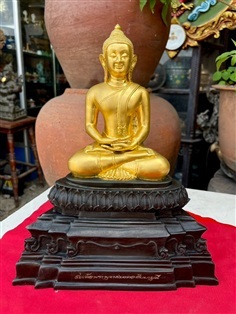สมเด็จพระพุทธมงคลชัยยะมุนี ปางประธานพร (ปิดทอง) ครองจีวรห่มเฉียง อริยาบถมั่นคง เรียวงดงาม ในท่านั่งขัดสมาธิเพชร ประทับบนฐานดอกบัว พระแท่นบัลลังก์ทิพย์ ผ่านพิธีพุทธาภิเษก มหามงคล