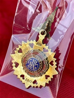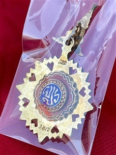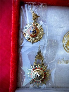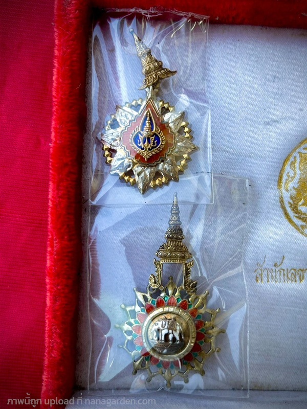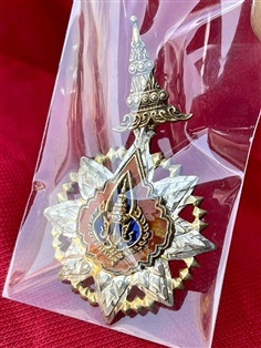 เครื่องราชชั้นตริตาภรณ์มงกุฎไทย ชฎาลายกนก งานวิจิตรช่างศิลป์วังหลวง ออกแบบและเป็นเกียรติอย่างยิ่ง โดยด้านหน้าเป็นมงกุฎไทย เนื้อเงินลงยาสองสี ในกรอบกระจกลายดวงดอกไม้ สองชั้น หลังตรา จปร. สมัยรัชกาลที่5