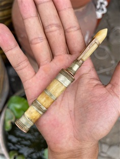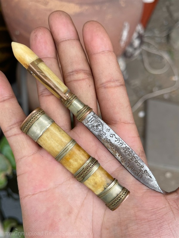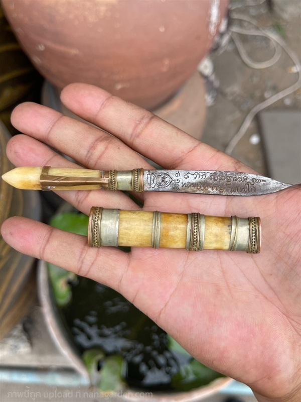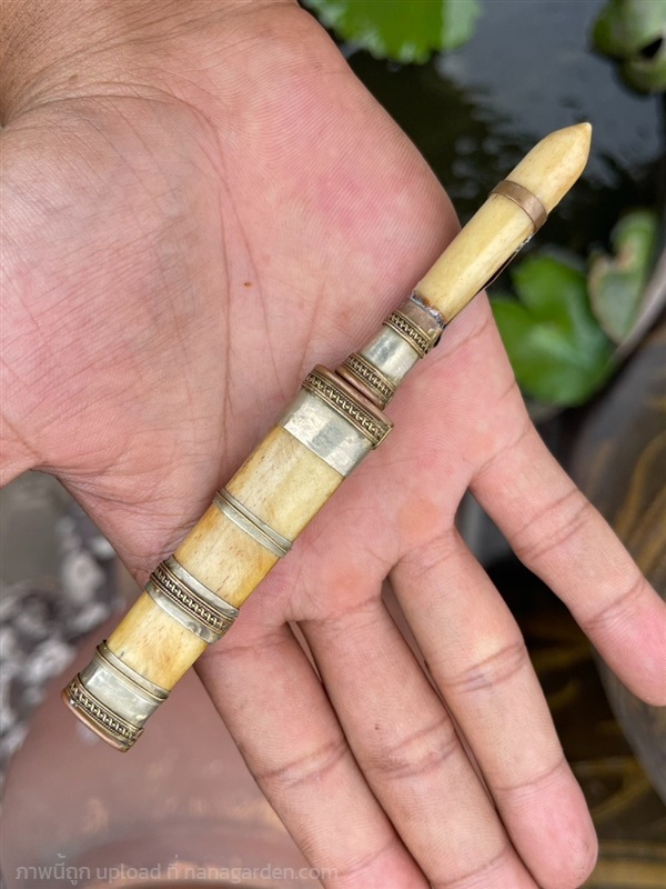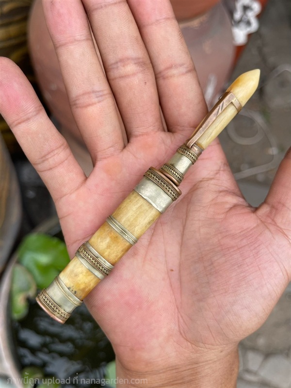 มีดปากกา กระดูกแกะ มีดหมอเก่า ลพ.รวย วัดตะโก จังหวัดอยุธยา เข้มขลัง ผิวเดิมสีธรรมชาติ หุ้มฉนวนสีเงินนาค งานวิจิตรฝีมือชั้นครู ต้นแบบมีดอาคมดั้งเดิม มีอักระยันต์ขอมบนใบมีด อายุหลายสิบปี