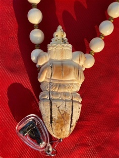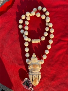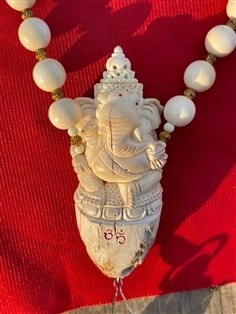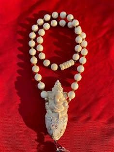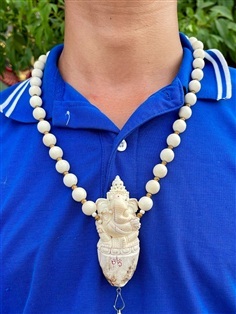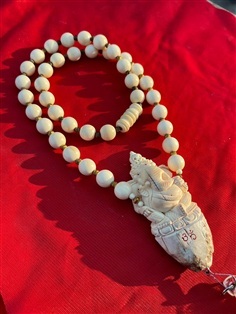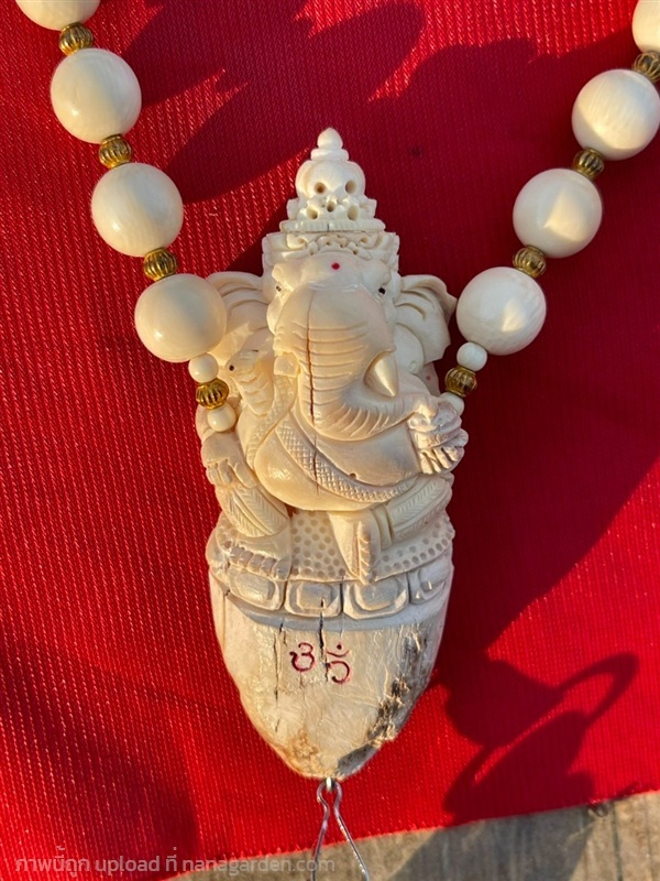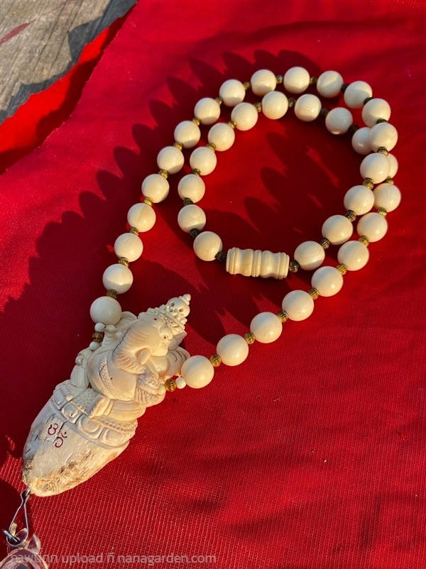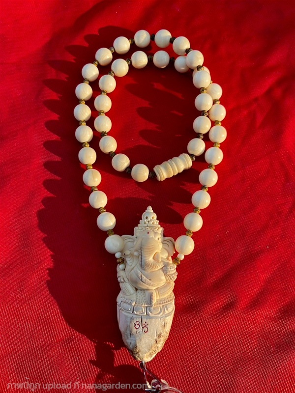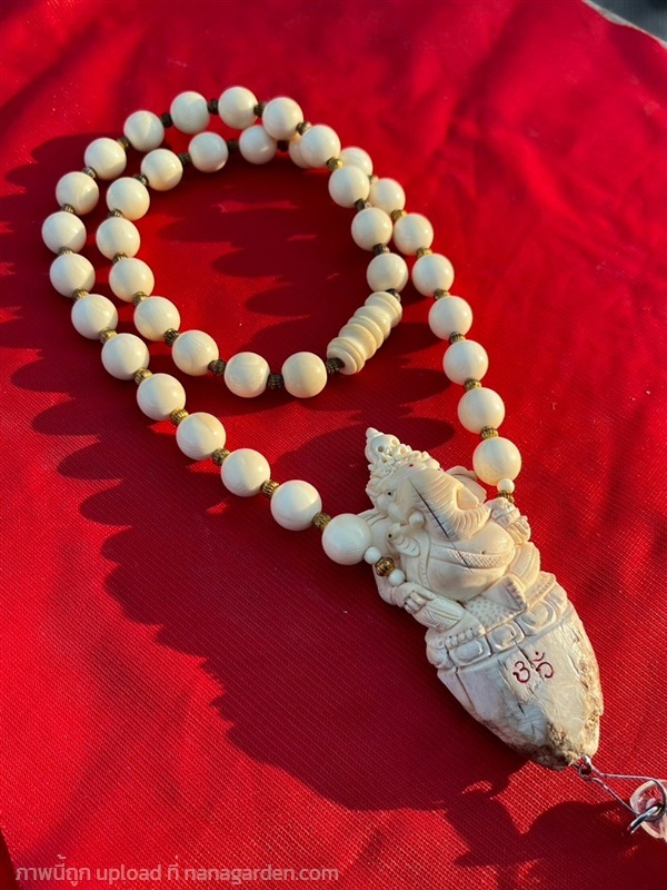 สร้อยงาเก่า อายุยาวนาน สีขาวเมฆ มีเม็ดปะคำงาแกะเม็ดใหญ่ ตัวจบทรงกระบอก โดยเฉพาะหัวสร้อยงา เป็นปลายงาตันชิ้นใหญ่ แกะสลักรูปพระพิฆเนศ เต็มองค์ มีหูห้อยพระ